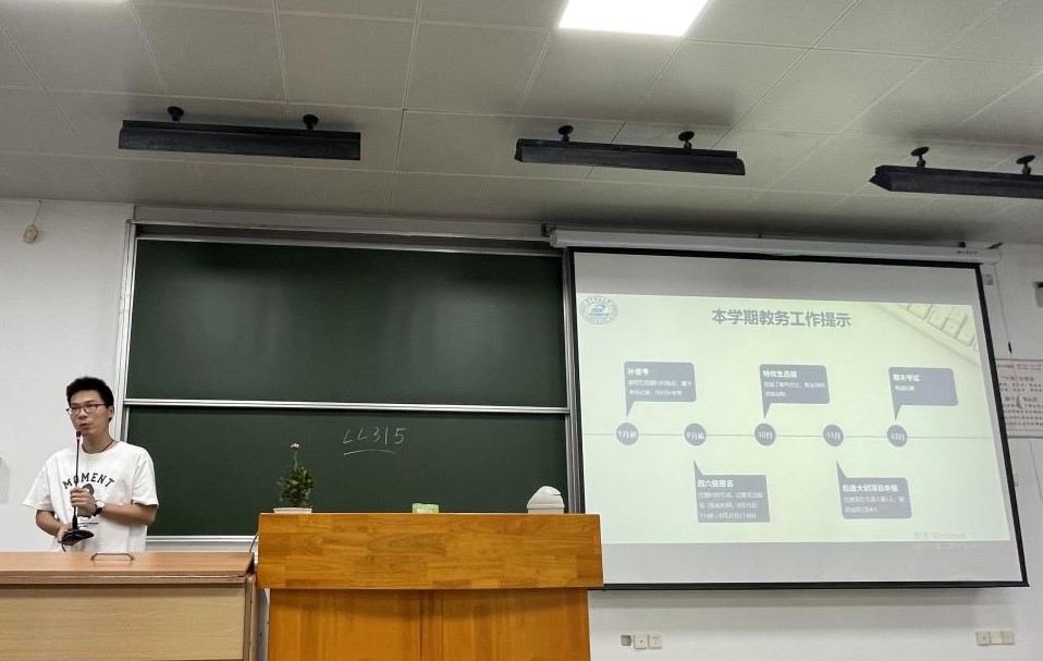 陈国威老师开展本学期教务工作部分的提示。按照时间线,陈老师讲解了补缓考和四六级报名相关事项,提醒同学们关注特优生选拔及院级大创项目申报,并对关于培养计划上容易忽略的学分做了强调,为同学们的学业提供了指导。